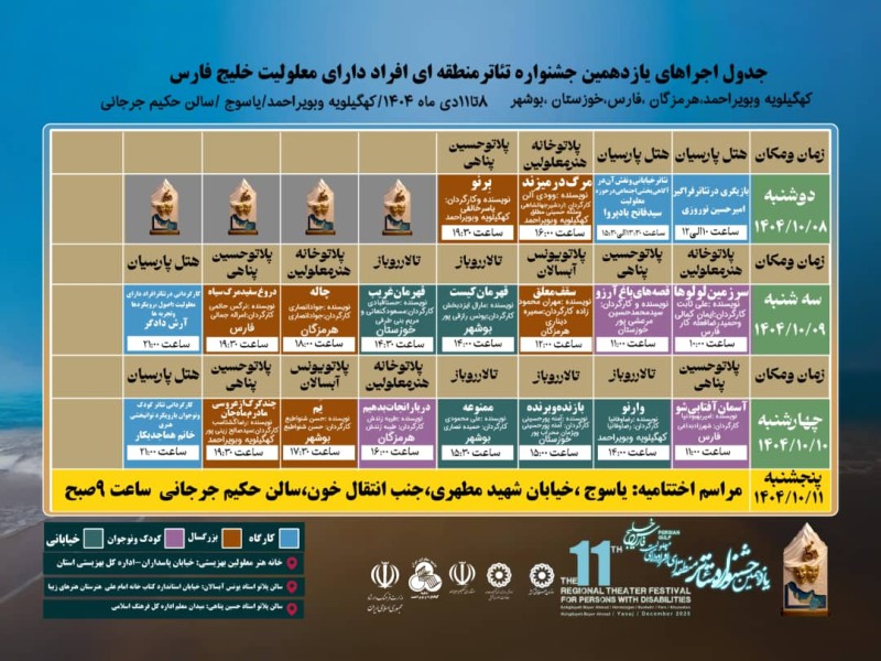 دبیر اجرایی یازدهمین جشنواره منطقه‌ای تئاتر خلیج فارس، از انتشار جدول کامل اجراهای نمایشی و رویدادهای جانبی این جشنواره خبر داد و اعلام کرد زمان و مکان اجرای آثار راه‌یافته و نشست‌های تخصصی به‌طور دقیق مشخص شده و در اختیار هنرمندان و مخاطبان قرار گرفته است.